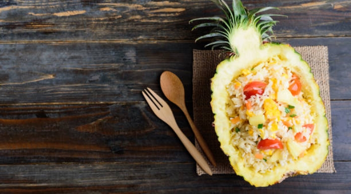 Pineapple Fried Rice is a vibrant Thai dish made with fragrant jasmine rice, stir-fried with pineapple chunks, vegetables, and a mix of savory and sweet spices, often topped with cashews and a choice of protein.