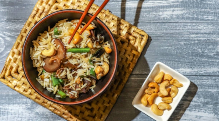 Kaju Fried Rice is a rich and aromatic dish made with stir-fried jasmine rice, crunchy cashew nuts, vegetables, and a blend of spices for a delightful, nutty flavor.