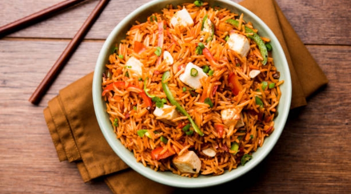 Spicy stir-fried rice tossed with vibrant vegetables and bold Schezwan flavors.